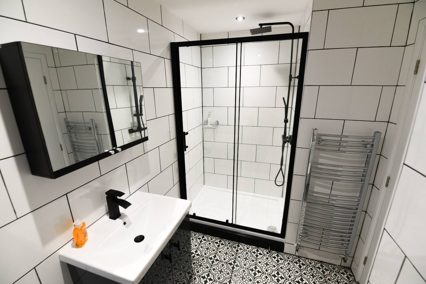 The modern bathroom features a steamy hot shower, sleek fixtures, and all the essentials for a refreshing and comfortable experience.
